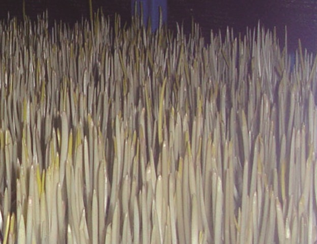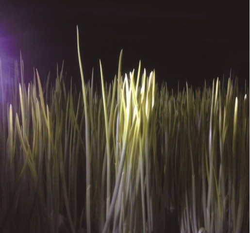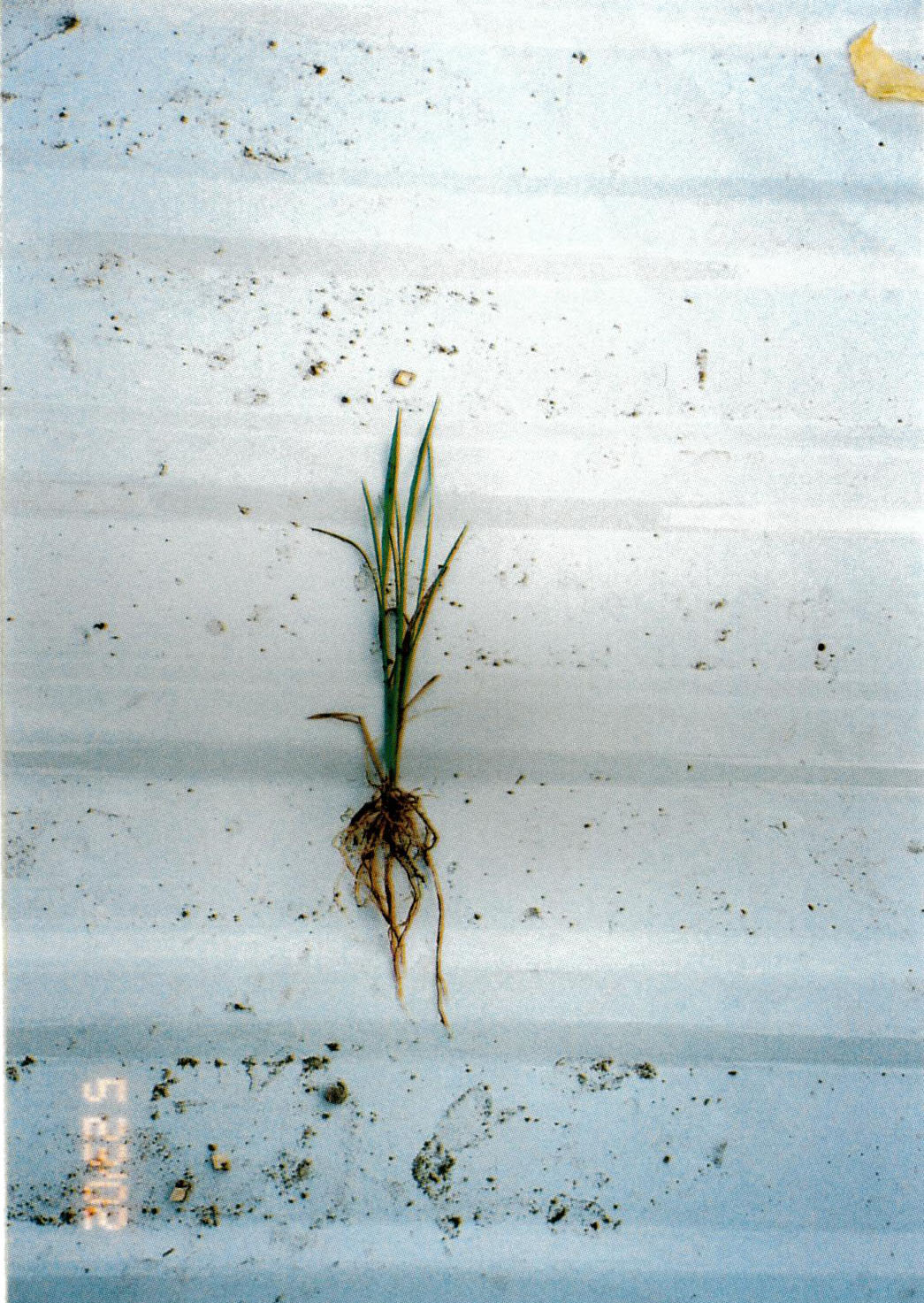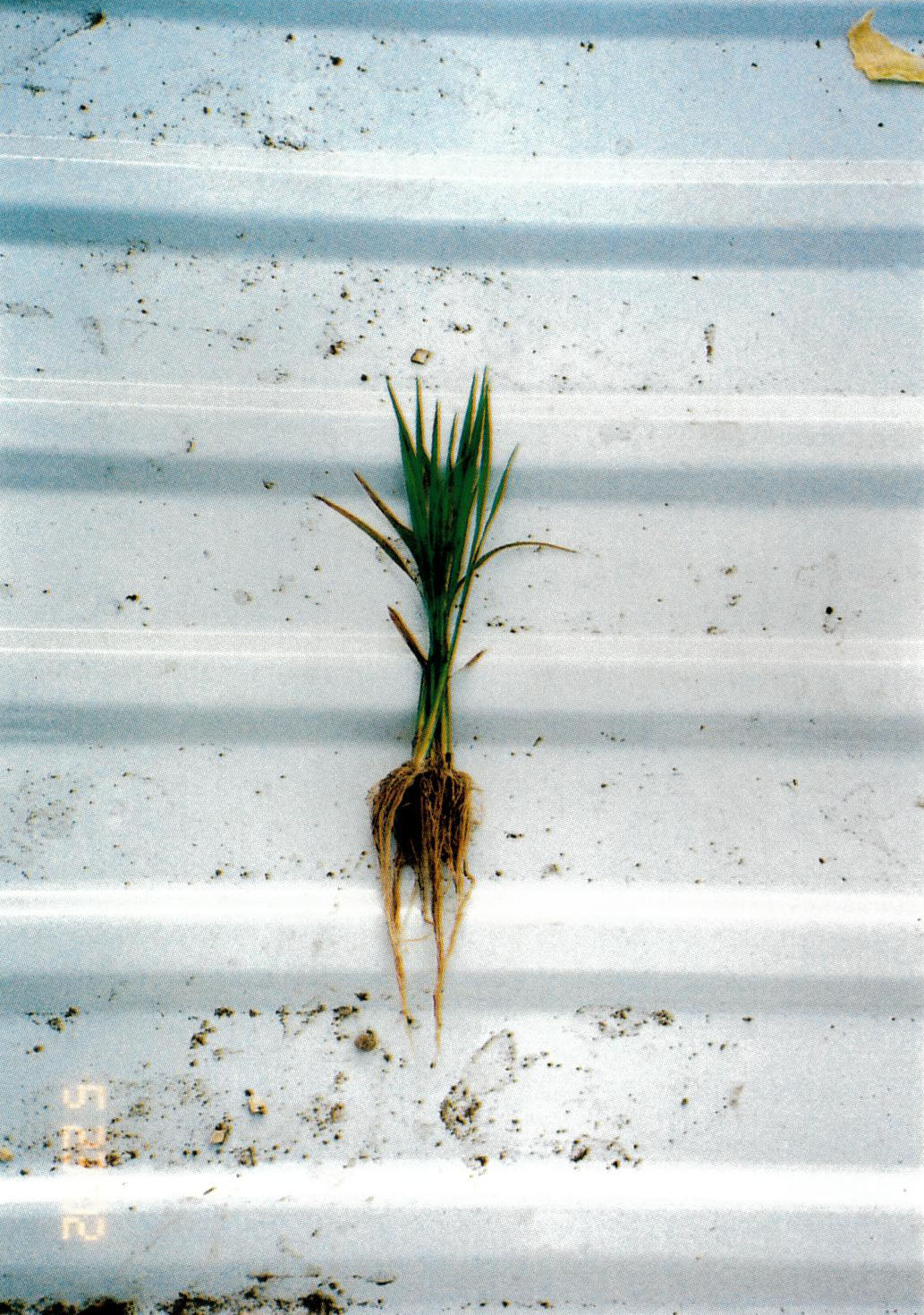 | 光触媒使用は根本の葉もまっすぐ伸びているが、農薬 使用の方は根本の葉がバラバラに垂れ下がっている。 |